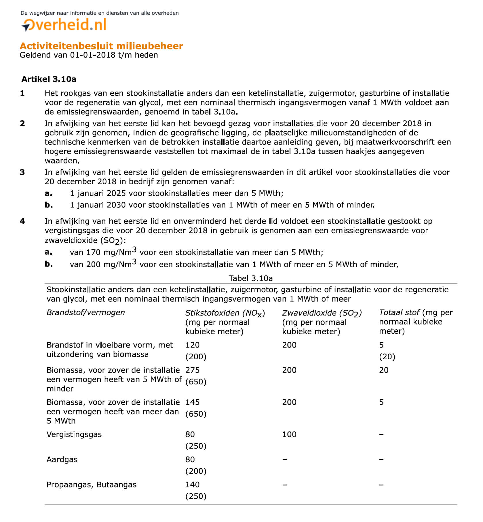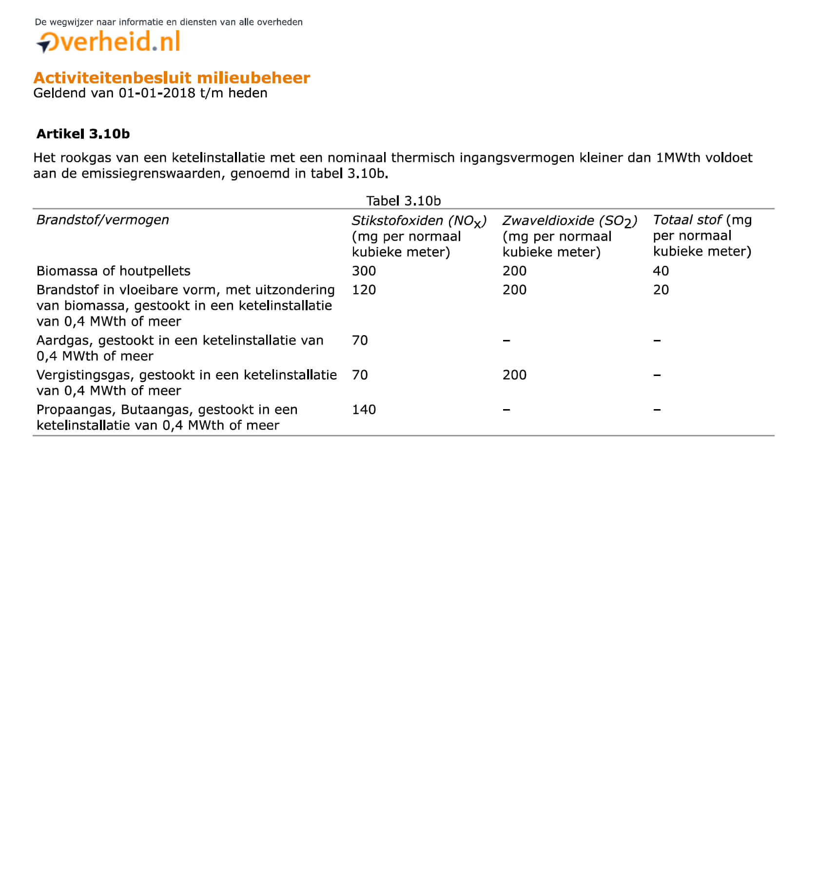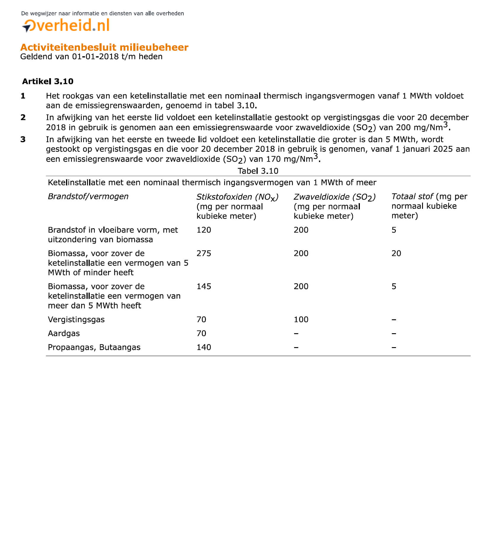 Hieronder staan drie tabellen uit het activiteitenbesluit met daarin vermeld de emissiegrenswaarde voor ketelinstallatie. De emissiegrenswaarde wordt mede bepaald door het nominaal thermisch ingangsvermogen van de installatie en de ingebruikname van de installatie.
